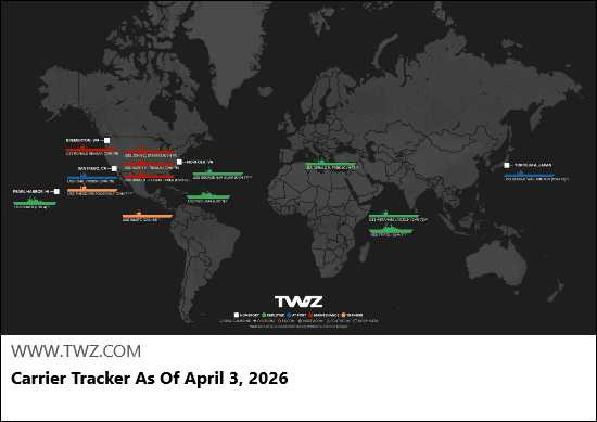 Third American carrier strike group deployed this week in support of Operation Epic Fury The post Carrier Tracker As Of April 3, 2026 appeared first on The War Zone.