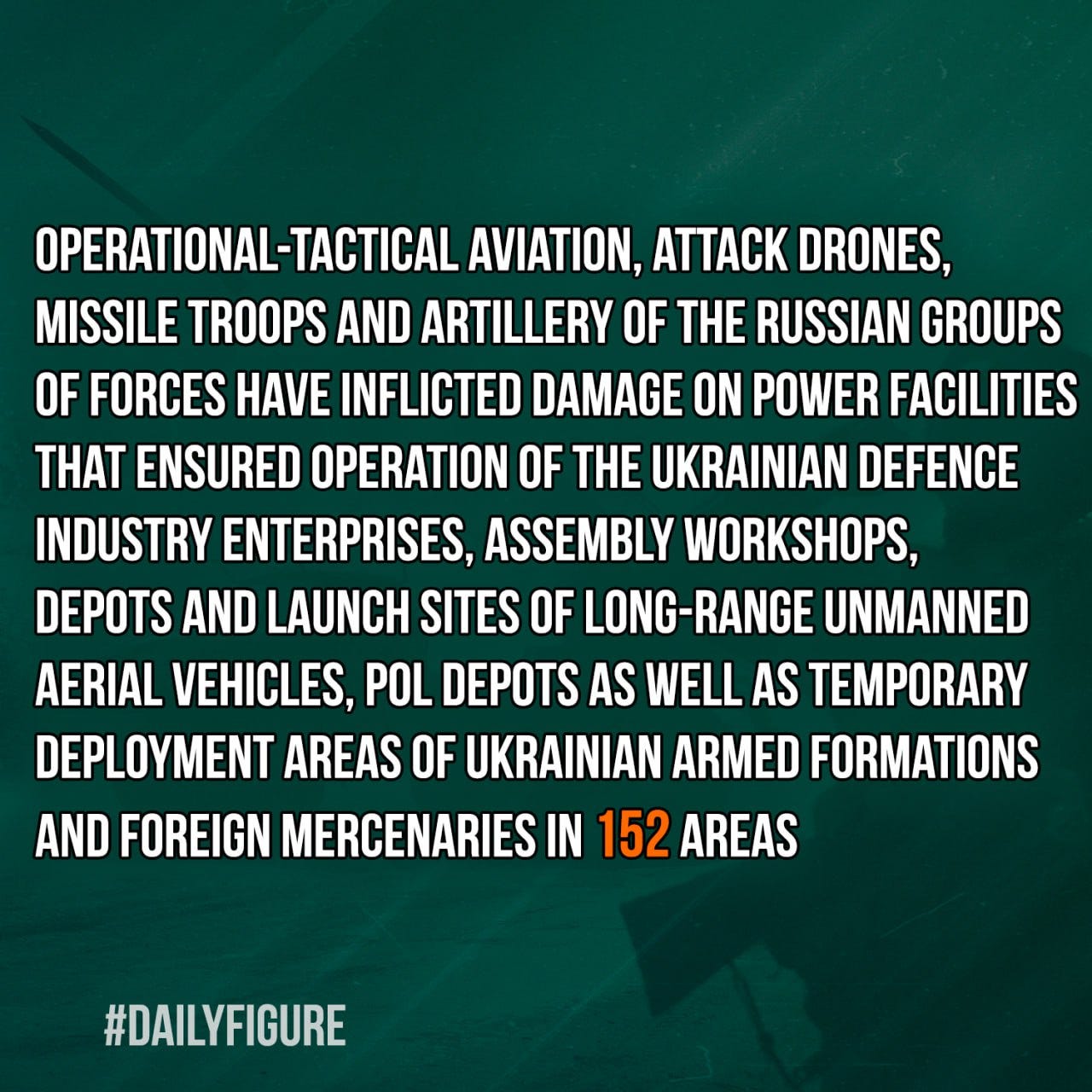 ✈️ Operational-tactical aviation, attack drones, missile troops and artillery of the Russian Groups of Forces have inflicted damage on power facilities that ensured operation of the Ukrainian defence industry enterprises, assembly workshops, depots and launch sites of long-range unmanned aerial vehicles, POL depots as well as temporary deployment areas of Ukrainian armed formations and foreign mercenaries in 152 areas.