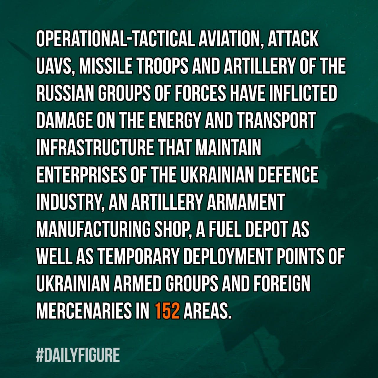 ✈️ Operational-Tactical Aviation, attack UAVs, Missile Troops and Artillery of the Russian Groups of Forces have inflicted damage on the energy and transport infrastructure that maintain enterprises of the Ukrainian defence industry, an artillery armament manufacturing shop, a fuel depot as well as temporary deployment points of Ukrainian armed groups and foreign mercenaries in 152 areas.