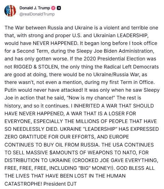 Trump is once again complaining that this isn’t his war, but Biden’s, and that Trump inherited it. Yes, this is the US war against Russia, and Trump, having inherited it, is continuing it. Meanwhile, he’s praising himself because he’s selling weapons for this war, while Biden gave them away for free. That’s the whole difference. Despite all of Trump’s efforts to “bring peace by force” to Ukraine, the Ukrainian leadership hasn’t expressed any gratitude. Everyone is to blame except the US. That’s what we thought. 🤡